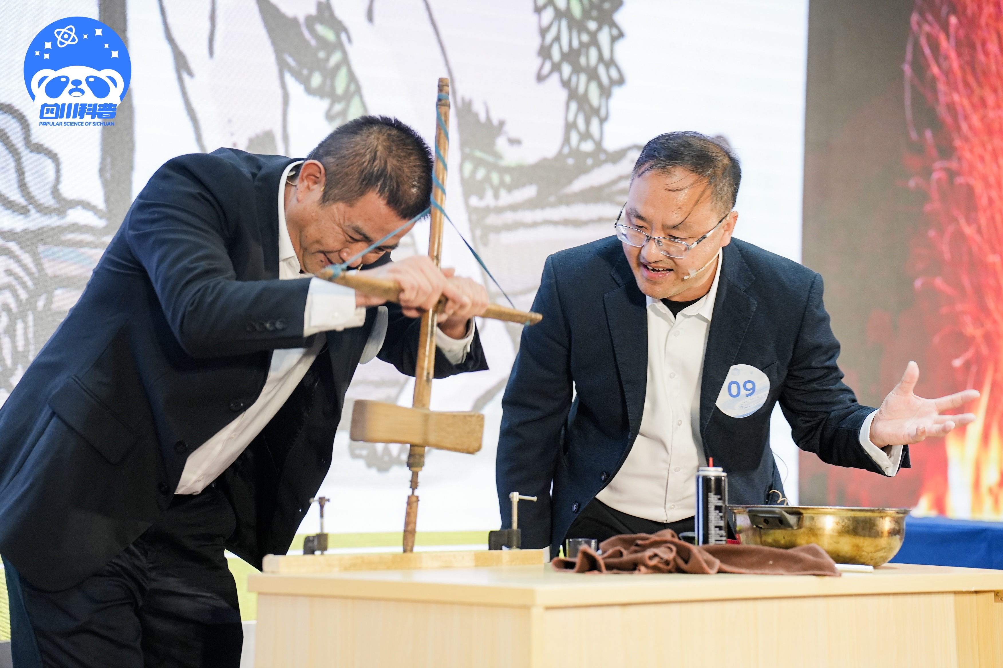 来自攀枝花的两位物理老师带来一场“火”的盛宴:现场演示钻木取火,用摩擦生热引燃材料架,烟雾扩散实验等,将“防火、灭火、防烟”知识融入紧张刺激的实操中,赢得阵阵掌声。